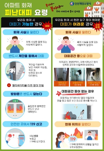 소방서 관계자는 “시민 여러분께서는 재난에 대비해 대피계획을 세우고 화재 발생 상황의 적절한 판단 후 대피하시길 바란다”며 “계양소방서에서는 이와 관련한 카드뉴스 리플렛을 제작 및 배포하고있으니 많은 관심 부탁드린다.”고 말했다.