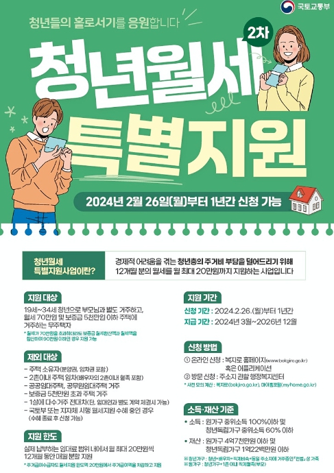 ‘청년월세 2차 특별지원’은 지역 내 청년에게 월 20만 원씩 1년간 최대 240만 원의 월세를 지원하는 사업으로, 지난 2022부터 3년 1차 지원 대비 재산과 임차보증금 기준이 완화됐으며, 청약통장 필수 가입 조건이 추가됐다.