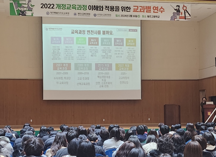연수는 ▲2022 개정 교육과정 총론의 주요 변화 사항 (아라중학교 수석교사 채홍순 선생님, 오름중학교 수석교사 김숙자 선생님) ▲2022 개정 교육과정 교과별 이해·활용 (교사 오인실 외 17명 선생님)으로 구성됐다.