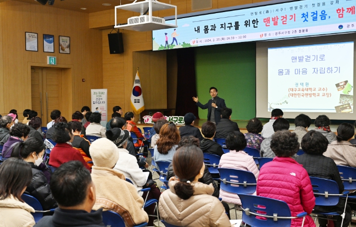 서구는 '맨발혁명'의 저자이자 대한민국 맨발학교 교장인 대구교대 권택환 교수를 초청해 ‘맨발걷기로 몸과 마음의 주인되기’라는 주제로 맨발 인문학 강의를 진행했다. 이어 맨발 걷기 전도사로 알려진 걷기지도자 정찬용 강사가 맨발걷기 방법 및 효과에 대해 교육했다.
