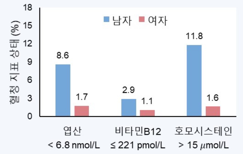 한편, 비타민B12의 결핍 또는 경계 결핍 비율은 남자 2.9%, 여자 1.1%로 남자에서 더 높았으며, 고호모시스테인혈증(혈중 호모시스테인 농도 15 μmol/L 초과) 비율도 남자 11.8%, 여자 1.6%로 남자가 여자보다 7배 이상 높았다. 혈중 엽산 농도나 비타민B12 농도가 낮은 사람일수록 혈중 호모시스테인 농도가 높은 것으로 나타났다.