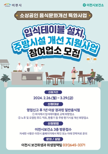 사업 신청은 2월 26일부터 3월 29까지 이천시보건소 보건위생과 위생정책팀으로 방문 접수하며, 제출 서류는 이천시 홈페이지 공고문에서 확인 가능하다.