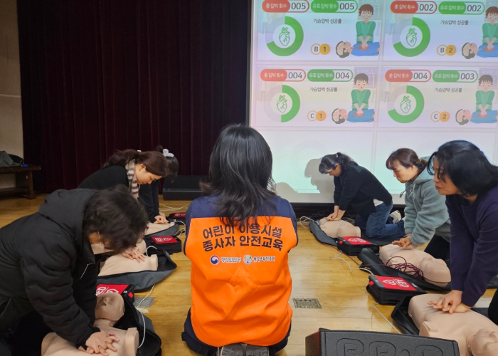 이날 교육은 종사자 150여 명이 참석한 가운데 한국보육진흥원 소속 박다름 강사의 진행으로 ▲영아·소아·성인 대상 심폐소생술 ▲대상별 기도 폐쇄 대처법 ▲자동심장충격기(AED) 사용법 등의 이론과 실습으로 진행됐다.