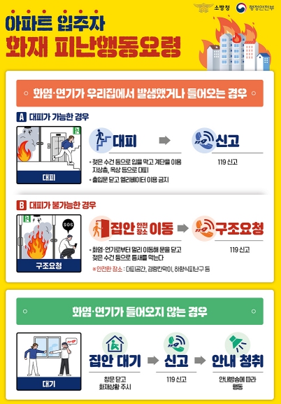 이에 무조건 대피보다 화재 발생 장소와 불길·연기의 영향 여부 등 대피 여건을 판단해 상황에 맞게 살펴서 대피해 달라고 당부했다.