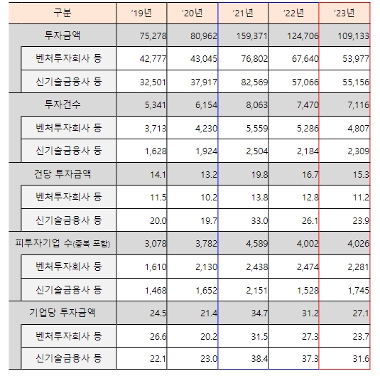 ![]() 최근 5년간(’19~’23) 연도별 신규투자 현황(억원, 건, 개사) |