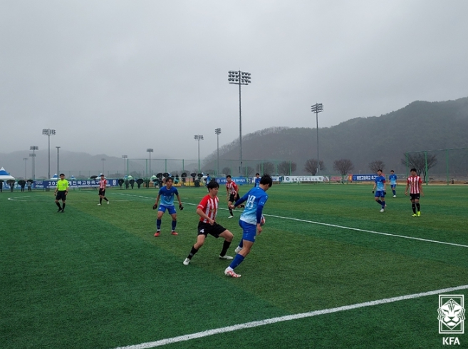 결국 주도권을 잡던 수원공고가 리드를 잡았다. 전반 36분 코너킥 상황에서 권민세의 킥을 황준호가 빠르게 뛰어들어 강력한 헤더로 연결해 골망을 흔들었다. 경기 초반부터 코너킥을 많이 획득했던 수원공고의 전략이 결실을 맺은 순간이었다.