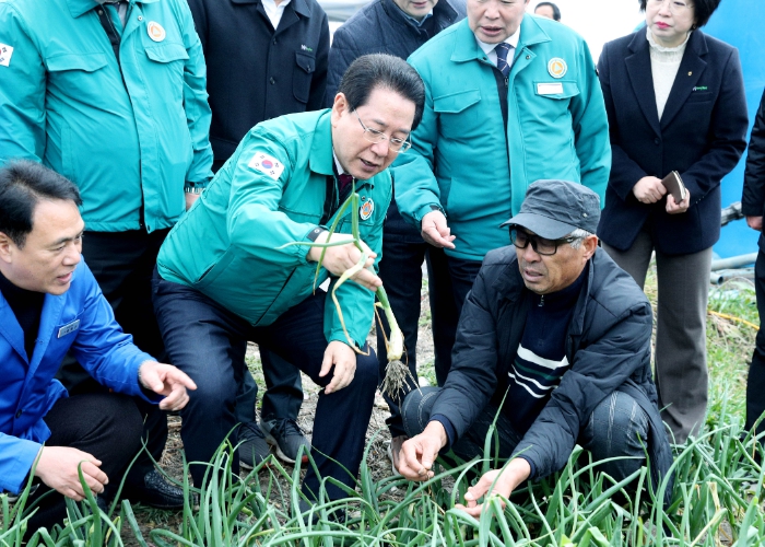 ![]() 김영록 전라남도지사가 20일 한파 피해를 입은 고흥 금산면(거금도) 조생종 양파 재배 현장을 방문, 피해 현장을 살펴보고 있다. |