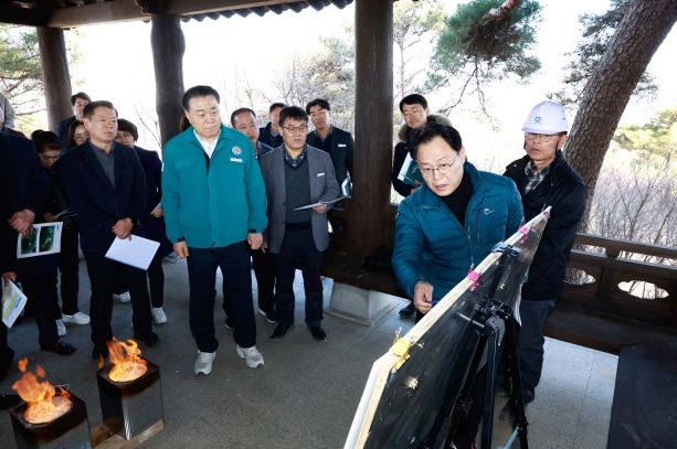 ![]() 조영일 건설교통실장이 군수 등 간부 공무원에게 개미산 전망대 조성 사업에 대하여 설명하는 모습 |