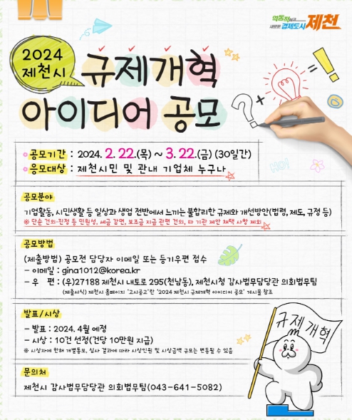 2월 22일부터 진행되는 이번 공모는 제천시민 또는 관내 기업체 소속이면 누구나 응모할 수 있으며, 담당자 이메일 또는 등기우편(충북 제천시 내토로 295, 제천시청 감사법무담당관 의회법무팀)으로 3월 22일까지 신청서류를 제출하면 된다.