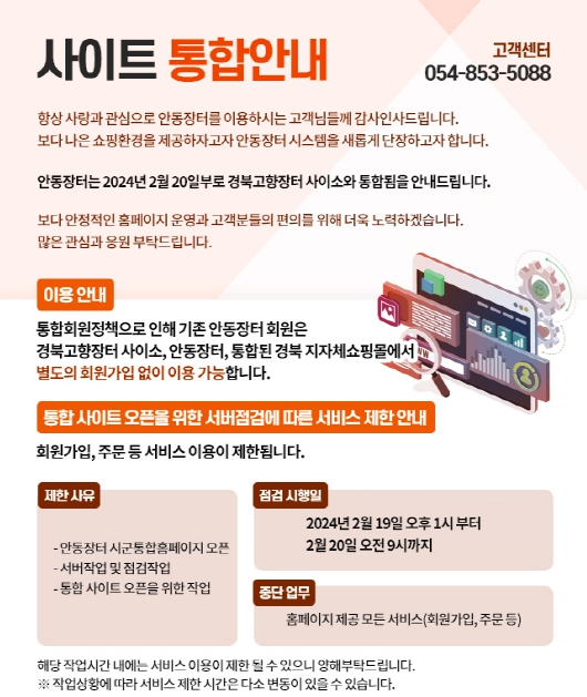 한편, 안동시는 통합으로 인한 혼란을 방지하기 위해 지난 1월 30일 안동장터 위탁 업체인 ㈜웨보노믹스에 의뢰해 입점 업체 대표 30여 명을 대상으로 설명회를 개최하고 안동장터 홈페이지 개편 안내 교육과 함께 안동장터 홈페이지 팝업 공지 안내를 통해 사전 안내를 진행해 통합에 따른 불편을 최소화했다.