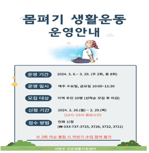 ![]() 서원주 건강생활지원센터, 몸펴기 생활 운동 참가자 모집 |