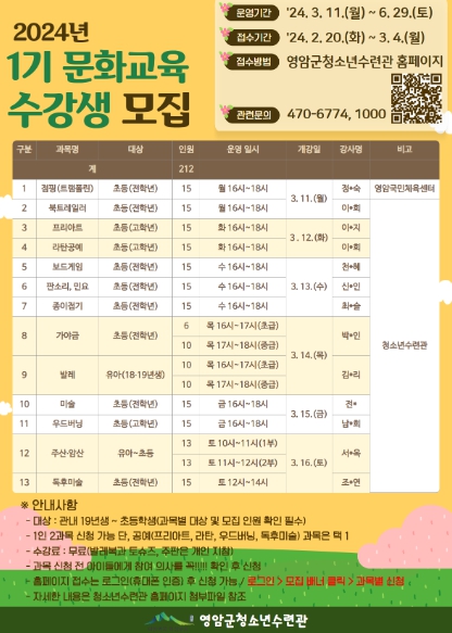 ![]() 영암군청소년수련관, 문화교육 수강생 모집 |