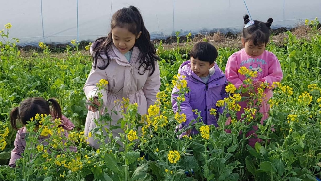 ![]() 강진 청자축제장 유채꽃밭을 찾은 어린이들이 유채꽃을 호기심 어린 눈으로 바라보고 있다. |