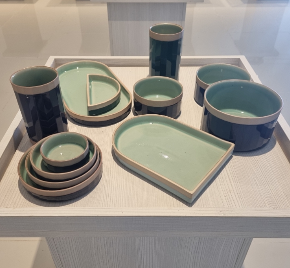 ![]() 민간요에서 개발한 한국전통문양을 응용한 식기세트가 강진 민간요 개발 신상품 전시실에 전시돼 있다. |