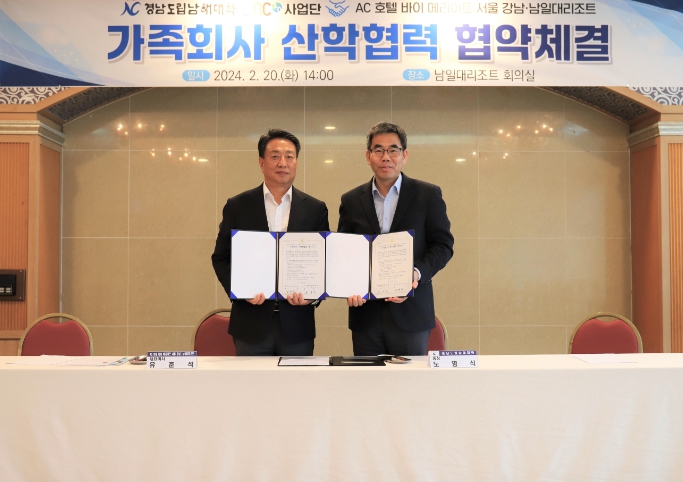 한편, 이날 남해대학과 가족회사 협약을 체결한 AC 호텔 바이 메리어트 서울 강남·남일대리조트는 호텔전문기업 ㈜희앤썬 소유 기업으로, 지난해 2월 23일 사천시와 투자업무협약을 체결하고, 새 호텔 건립을 위한 3천억 원의 투자와 200명의 신규 고용을 약속한 바 있다.