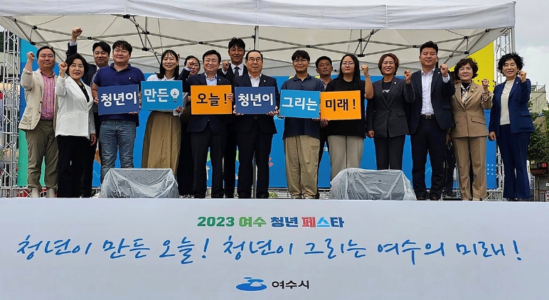 ![]() 2023년 청년페스타에서 정기명 시장이 참여자들과 기념사진을 찍고 있다. |