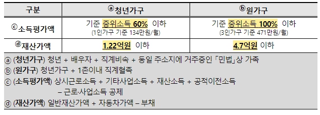 ![]() 청년가구 및 원가구의 소득·재산 요건 |