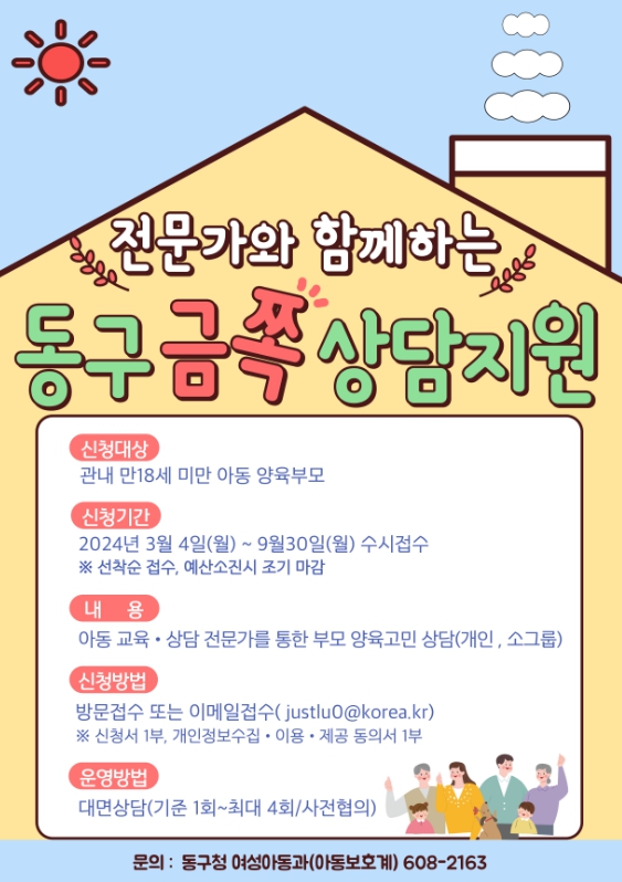 ![]() “부모 양육 코칭 ‘동구 금쪽 상담’ 받으세요!” 아동 보호자 대상…3월부터 9월까지 선착순 수시 접수 |