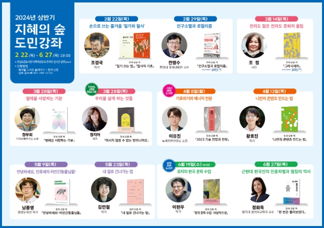 박용학 전남도립도서관장은 “도민이 행복한 삶을 누리는 데 도움이 되는 다양한 인문학 강좌를 준비했다”며 “지혜의 숲 도민강좌, 찾아가는 도민 강좌에 많은 관심 갖고 참여해달라”고 당부했다.