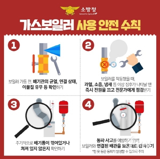 이에 소방서는 보일러 가동 전 배기관 균열ㆍ연결상태ㆍ이물질 유무 등 확인, 보일러 작동 시 과열ㆍ소음 등 이상징후 나타날 시 즉시 전원 끄고 점검 받기, 배기관 연결부 고정 확인, 전문가를 통한 안전점검 받기 등의 안전수칙 준수를 당부했다.