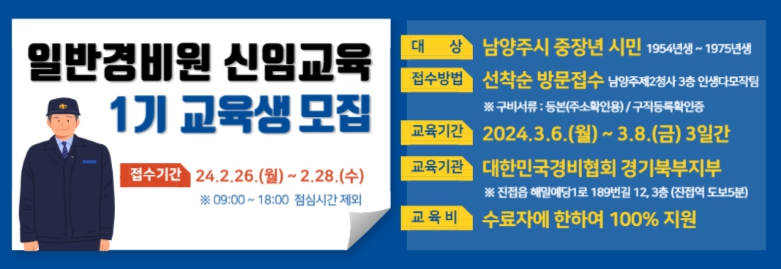 시는 먼저 일반경비원 신임교육으로 연간 120명을 대상으로 1~4기에 기수당 30명을 선발한다. 일반경비원 신임교육은 단기과정으로 1기는 3월 6일부터 8일까지 3일간 운영되며, 시설경비·호송·기계경비 실무 등 관련 법령까지 경찰청 지정 교육기관을 통해 교육받는다. 교육 후 공동주택, 빌딩 등 경비를 필요로 하는 모든 시설에 취업하게 된다.