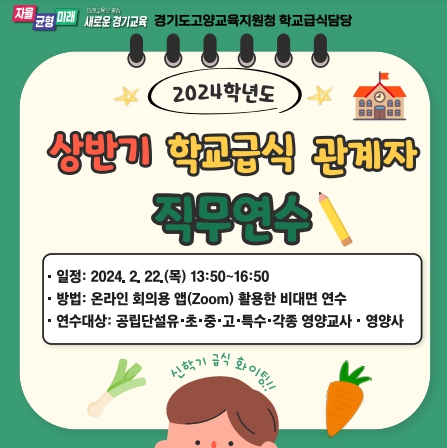 특히, 2024학년도 신학기를 맞아 고양시청 역학조사관을 특별 강사로 초빙하여 식중독 발생 초기 현장 대응 방법 및 의심 환자 가검물 채취, 식중독 사고 사후 조치 등 학교급식 위생·안전 사고 예방을 위한 현장 맞춤형 교육을 중점적으로 실시할 계획이다.