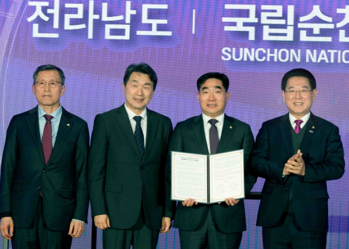 ![]() ‘글로컬대학30 혁신 이행 협약식’이 21일 충북대학교에서 열린 가운데 김영록 전라남도지사, 이주호 사회부총리 겸 교육부장관, 이광복 한국연구재단이사장, 이병운 순천대총장이 4자 이행협약을 하고 있다. |