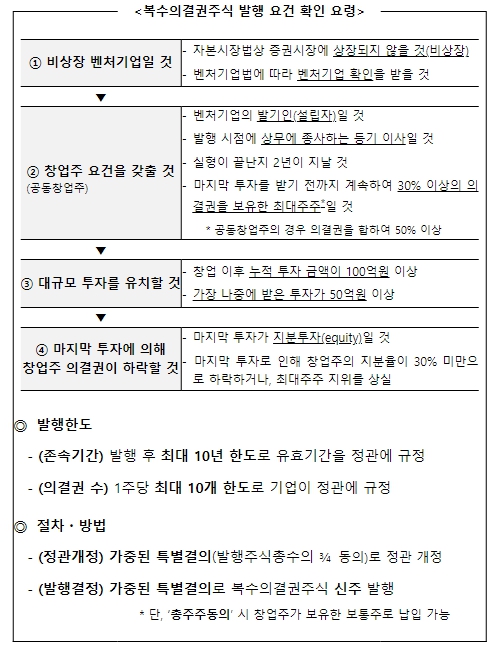 복수의결권주식이란 1주당 최대 10개의 의결권이 부여되는 주식으로, 벤처기업이 지분 희석의 우려 없이 대규모 투자를 유치해 성장할 수 있도록 지원하기 위해 도입됐다.
