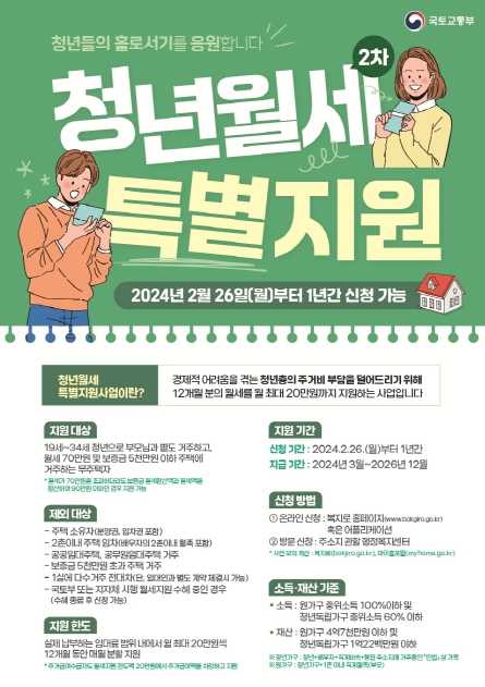 2차 사업 신청 기간은 오는 26일부터 내년 2025년 2월 25일까지 1년간이며, 지난 1차 사업(2022년~2023년) 대비 재산과 임차보증금 기준이 완화되고 청약통장 필수 가입 조건이 추가됐다.