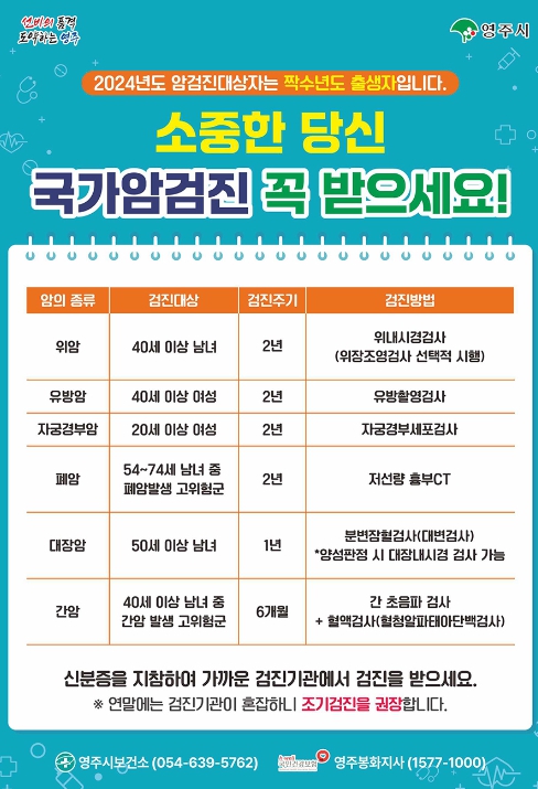 이러한 노력을 바탕으로 지난해에는 영주시가 국가암검진 수검률 46.1%(경북 41.31%)로 도내 1위를 차지한 바 있다.