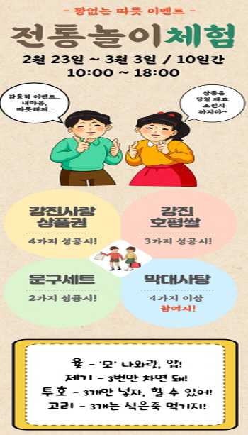 특히 찾아오는 모든 관광객들에게 즐거운 추억을 선사하기 위해 ‘꽝 없는 이벤트’도 진행한다. 윷놀이에서 모가 나오고, 제기 3번 차기, 고리 3개 끼우기, 투호 3개 넣기에 모두 성공하면 강진사랑상품권 5천원권을 증정하고, 3가지를 성공하면 강진쌀(1kg) 증정과 2가지를 성공하면 문구 세트를 증정한다. 모두 실패해도 4가지 모두 체험하면 사탕을 증정한다. 열흘 동안 오후 6시까지 운영되며 재고 소진시 이벤트는 종료된다.