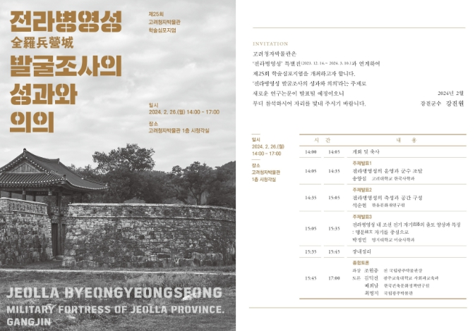 송양섭 교수(고려대학교 한국사학과)의 ‘조선 후기 강진 병영의 지휘체계와 군수 조달’이라는 주제 발표를 시작으로 석순현 팀장(한울문화재연구원)이 ‘전라병영성의 축성과 공간구성’이라는 주제로 전라병영성의 규모와 시설에 대한 발표로 이어진다. 마지막 발표는 박정민 교수(명지대학교 미술사학과)가 맡았으며, 전라병영성 내 출토된 명문 자기(銘文 瓷器)를 중심으로 조선 전기 자기의 출토 양상과 특징을 살펴보는 시간을 갖는다.