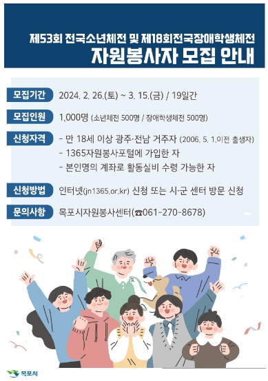 ![]() 목포시가 5월에 열릴 전국장애학생체전·제53회 전국소년체전을 성공적으로 이끌 자원봉사자 1,000명을 모집한다. / 목포시 제공 |