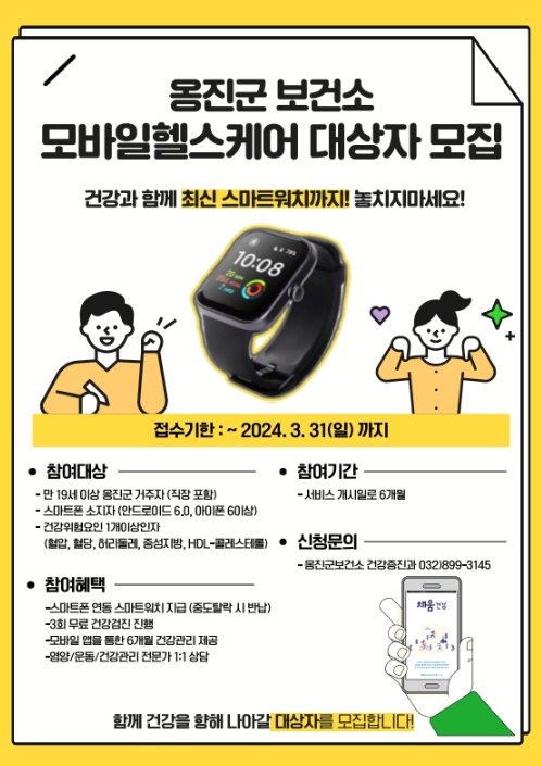 사업 대상자로 선정되면 손목형 스마트 워치가 무상으로 제공되며, 참여 희망자는 옹진군보건소 건강증진과로 예약 상담전화 후 검진일정에 따라 참여할 수 있다.