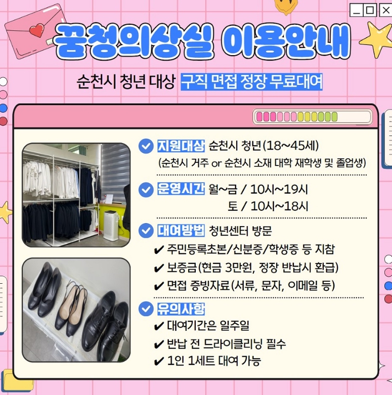 순천시청년센터 꿈청의상실은 취업 면접이 예정되어있는 18~45세의 순천시 거주 청년 및 순천시 소재 대학 재학생과 졸업생이라면 누구나 이용할 수 있다.