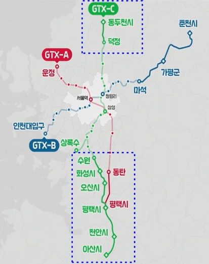 ![]() GTX A.C노선 연장 노선도(국토교통부 발표자료 일부 편집) |