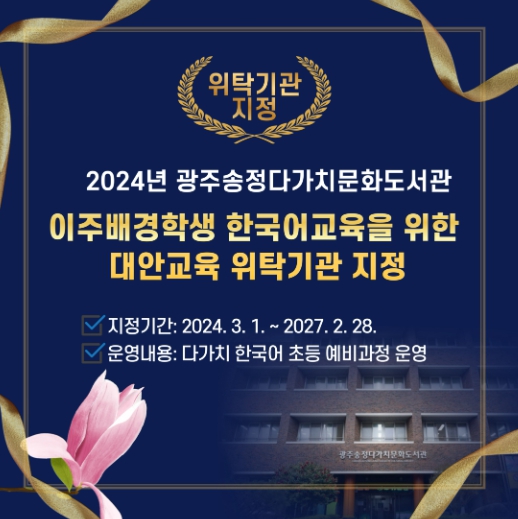 22일 광주송정다가치문화도서관에 따르면 이번 대안교육 위탁기관 지정은 이주배경학생 대상 한국어교육을 지역 내 대학교 등에 민간 위탁하는 경우가 많은 타 시·도와 달리 시교육청 산하기관이 위탁기관으로 지정받는 사례가 많지 않아 그 의미가 더 크다고 할 수 있다.