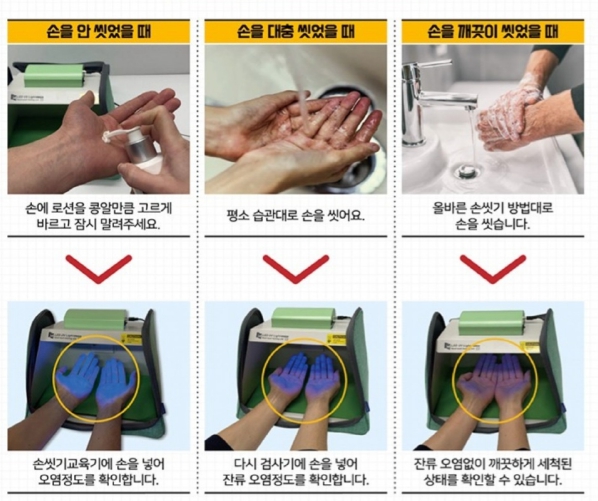 형광로션 바른 손을 씻은 뒤 뷰박스에 비추면 미처 씻겨 내려가지 않은 부분이 반짝이는 것을 볼 수 있다. ‘올바른 손씻기’ 방법을 익히고 다시 뷰박스를 이용해 깨끗해진 손을 확인하는 방식으로 교육이 이뤄진다.
