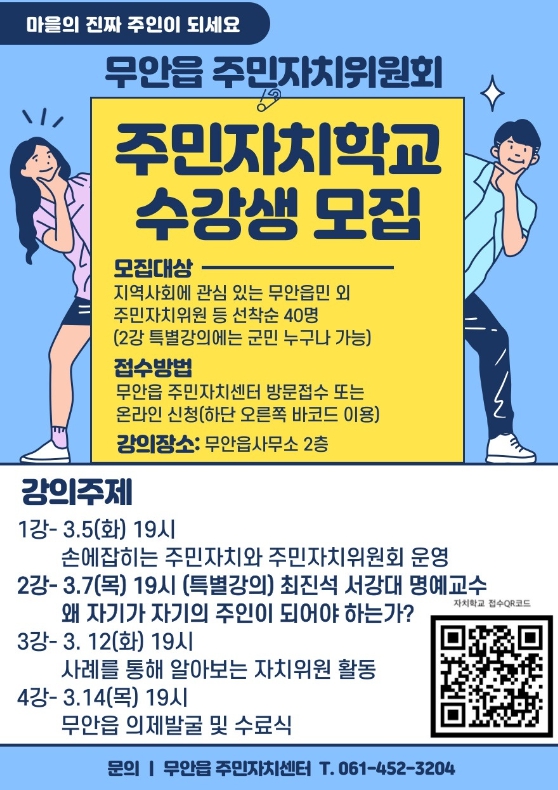 이숙아 무안읍장은 “이번 주민자치학교는 무안읍 주민들의 자치 역량을 강화해 지역 발전에 기여할 수 있는 좋은 기회가 될 것이다”라고 말했다.