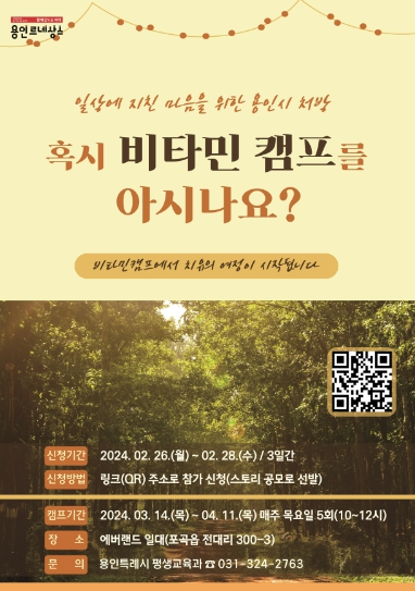올해부터 평생학습관이 운영하는 ‘더채움 아카데미’ 일환으로 마련된 ‘힐링 체험 프로그램’은 학습자 특징에 맞는 체험교육을 제공한다. 처인구 포곡읍 에버랜드 포레스트 캠프에서 다음 달 14일부터 5주 동안 매주 목요일 오전 10시부터 12시까지 진행된다.
