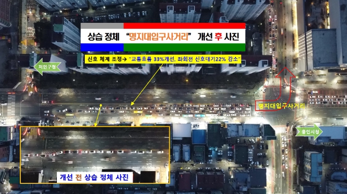 구는 용인동부경찰서, 용인시 첨단교통센터와 협업을 통해 해당 구간의 출·퇴근 시간 교통신호와 통행량을 분석해 기존 38초였던 좌회전 신호를 53초로 조정했다. 이후 좌회전 신호 대기는 기존 대비 22% 감소하고 교통 흐름은 기존 대비 33% 개선된 것으로 나타났다.