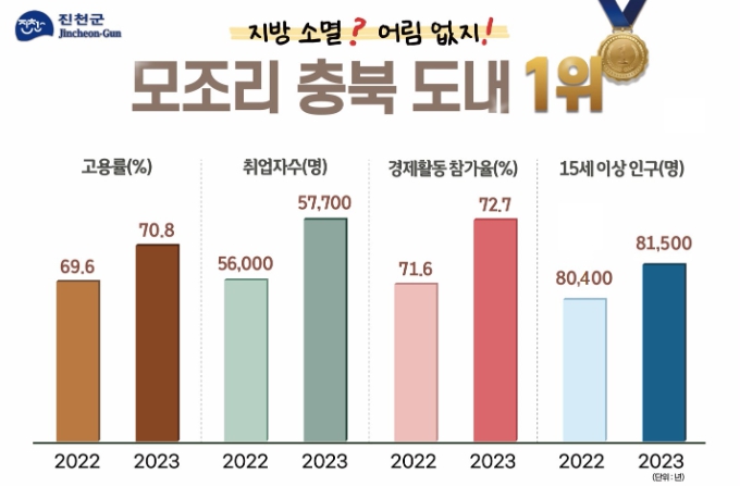 청년(15~29세) 고용률 역시 49.9%로 충북 도내 1위를 달성했으며, 고용률 외에도 진천군의 탄탄한 일자리 관련 지표는 여러 곳에서 확인할 수 있다.