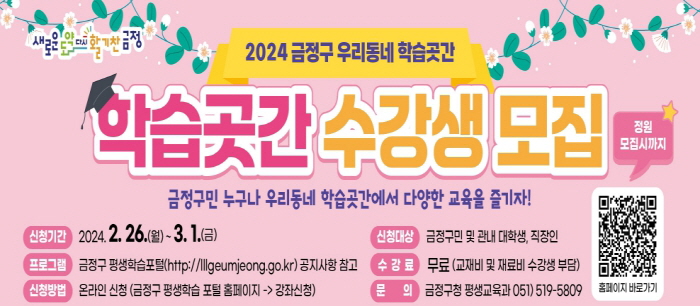 ![]() 부산시 금정구, 2024년 우리 동네 학습공간 '학습곳간' 수강생 모집 |