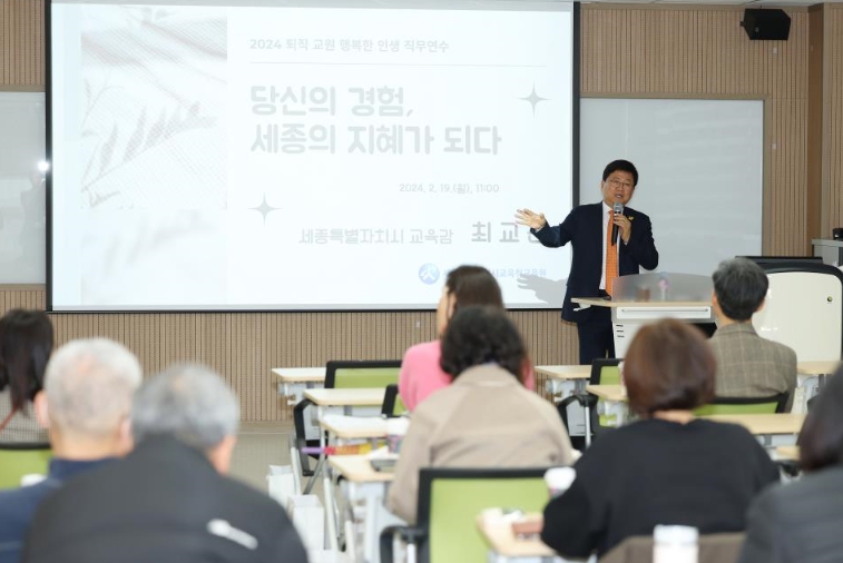 ![]() 세종특별자치시 최교진 교육감이 퇴직 교원의 사회 공헌에 대하여 특강을 하고 있다. |