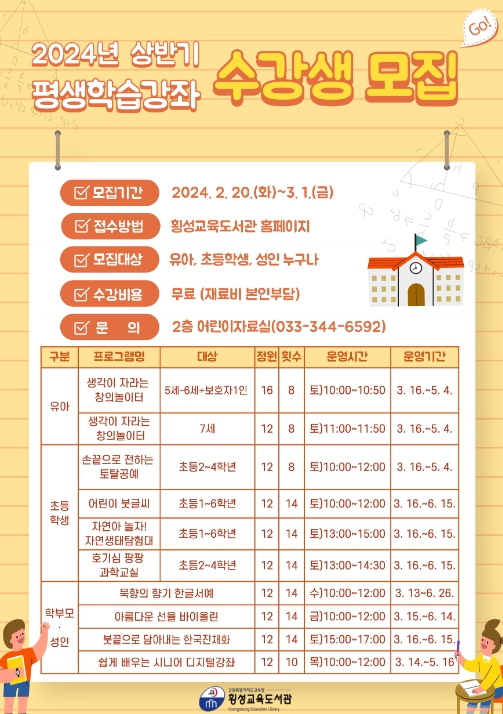 ![]() 횡성교육도서관 2024년 상반기 평생학습강좌 수강생 모집 홍보문 |