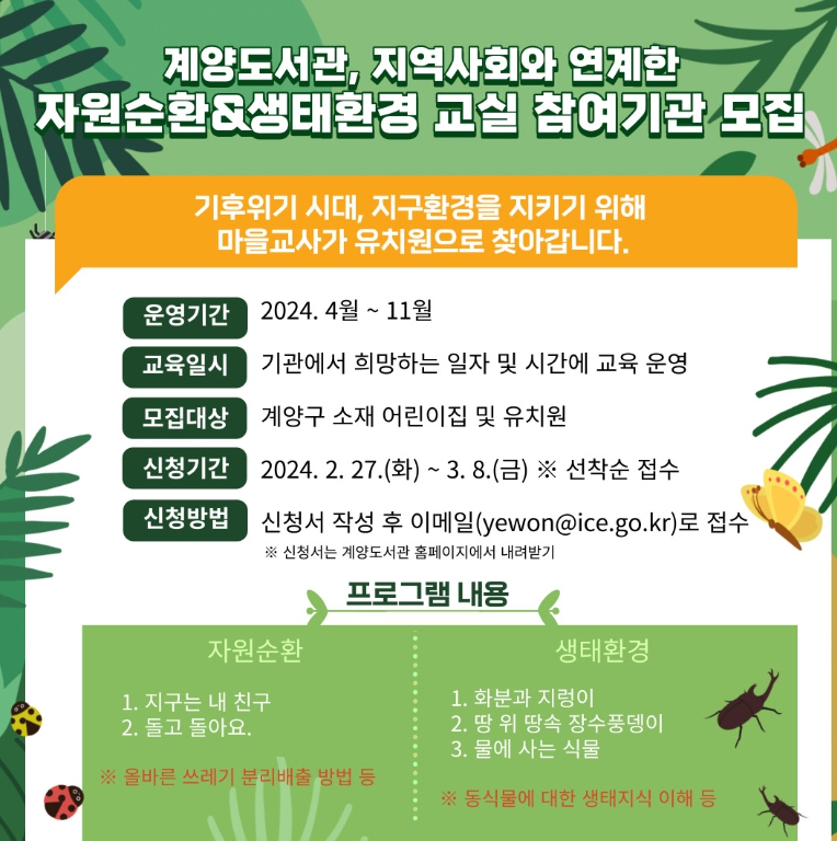 프로그램은 기후 위기 시대 인간과 자연의 공존을 위한 자원순환 및 생태환경 교육으로, 2021년과 2022년 계양도서관에서 양성한 자원순환‧생태환경 마을 교사가 참여기관으로 찾아가 진행한다.