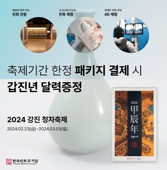 축제기간 중 관람과 민화 체험, 4D 가상체험을 모두 이용하는 코스인 ‘민화 체험 패키지’를 이용하는 모든 방문객들에게 박물관 소장용 민화로 제작한 갑진년 기념 벽걸이 달력을 증정할 예정이다. 해당 이벤트는 수량이 한정돼 있어 1인당 1개씩 증정받을 수 있으며, 준비된 달력이 모두 소진될 경우 조기 마감될 수 있다.