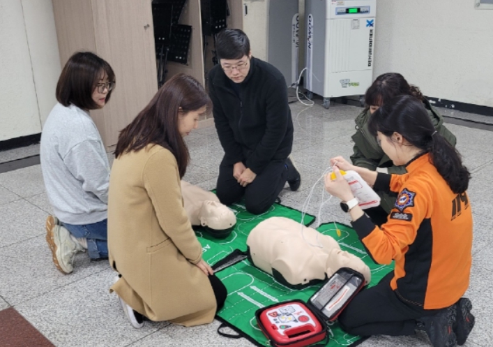![]() 제세동기 실습 중인 김포시 공직자들 |