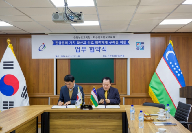 ![]() 21일 우즈베키스탄 타슈켄트한국교육원에서 김지철 충남교육감(우)과 팽주만 타슈켄트한국교육원장(좌)이 업무혁약을 체결하고 있다. |