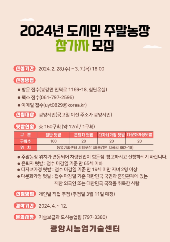 ![]() 광양시, 2024년 도시민 주말농장 참가자 모집 |